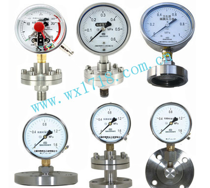 隔膜压力表采用间接测量结构,用隔离膜片将被测介质与敏感元件隔开,不锈钢隔膜适用于测量强腐蚀、高温、高粘度、易结晶、易凝固、有固体浮游物的介质压力以及必须避免测量介质直接进入耐震隔膜压力表内部和防止沉淀物积聚且要易清洗及周围环境有一定腐蚀性气体的场合。隔离膜片有多种材料,以适应各种不同腐蚀性介质。仪表适用于化学工业、化纤、合成纤维、石油、染化、制碱等工业,并有各种材质的隔离膜片及各种接口形式以供不同的工矿条件选用。